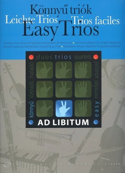 AD LIBITUM je nová série obsahující dua, tria a kvarteta v širokémrozsahu obtížnosti od jednoduchých až po náročnější aranžmá. Všechnyskladby jsou přepsany nebo aranžovány tak, aby hudebníkům nabídlyhodnotné a zajímavé kompozice pro variabilní kombinace nejrůznějšíchhudebníchnástrojů vhodných nejen pro žáky a studenty hudebních škol,ale také pro jejich absoloventy a starší muzikanty, kteří si hrají proradost a své vlastní potěšení.    Titul EASY TRIOS Vám nabízí snadné úpravy 22 skladeb, od lidových písníaž po skladby známých i méně známých skladatelů klasické hudby provariabilní kombinaci nejrůznějších hudebních nástrojů.  Set obsahujepartituru plus rozepsané party pro jednotlivé nástroje -1 hlas obsahuje party pro housle, příčnou flétnu, hoboj, vibrafon /2 hlas obsahuje party pro housle, příčnou flétnu , hoboj, vibrafon, klarinet  /3 hlas obsahuje party pro violoncello, fagot, marimbu, violu.