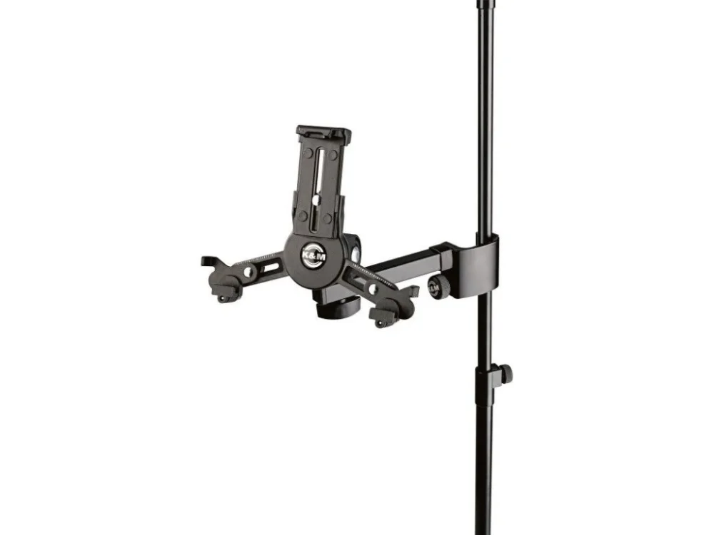 Univerzální držák na tablet pro použití ve studiu, na pódiu nebo doma. Lze snadno připevnit na jakýkoliv stojan s průměrem trubky do 30 mm. Individuálně nastavitelná opěrná ramena pro tablet s výškou 163/242 mm a šířkou 102/189 mm (například iPad mini, iPad Pro 9.7, Amazon Fire HDX 8.9, Google Nexus 9). Hloubka tabletu 5/11mm. Při prvním použití držáku tabletu se nastavení opěrného ramene provádí nastavením upínacích šroubů na velikost a hloubku tabletu. Pro jiná použití lze tablet rychle a jednoduše připevnit a odpojit pomocí západky. Alternativně lze přišroubovat na závit 3/8″. Vyrábí se v černé barvě.