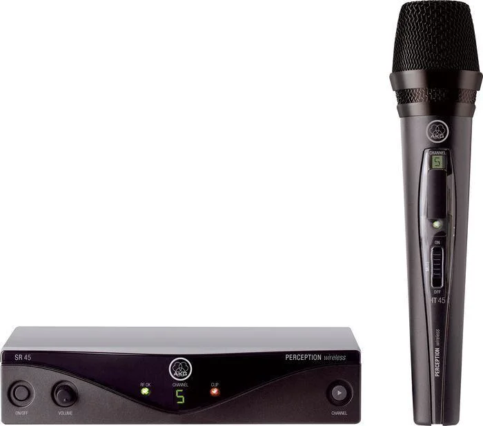 Součástí setu AKG Perception Wireless Vocal Set je přijímač AKG SR 45 a mikrofon do ruky AKG HT 45. Přijímač má na svém šasí minimum ovládacích prvků, přesto není nastavování parametrů nijak ochuzeno. K ovládání slouží potenciometr Volume, tlačítko Channel pro přepínání kanálů, LED displej zobrazující zvolený kanál, LED indikátory signálu a clippingu, vypínač a trimr pro nastavení squelche. Výstupy jsou osazeny XLR a ¼“ Jack konektory. Mikrofon obsahuje dynamickou mikrofonní vložku s kardiodní směrovou charakteristikou. Vyznačuje se vysokou odolností proti mechanickým ruchům i zpětné vazbě. Na těle mikrofonu je displej zobrazující zvolený kanál a tlačítko pro přepínání kanálů, přepínač citlivosti mikrofonu, LED indikátor stavu baterie a vypínač. AKG HT 45 je napájen jednou AA baterií, na níž dosahuje životnosti až 10 hodin.