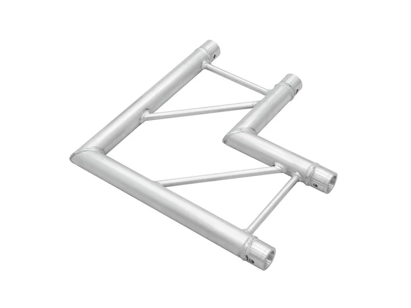 Hliníkový 2-bodový příhradový systém, 2-bodový rohový díl 90°. Jednotlivé díly se navzájem spojují kónickými spojkami, jištěnými čepy se závlačkami. Ke každému dílu je dodávána sada se dvěma kónickými spojkami vč. čepů a závlaček. Průměr trubek 50 mm, tloušťka stěny 2 mm, průměr vzpěr 16 mm. Vhodný pro instalaci na koncertní pódia, do obchodů, diskoték, výstavních hal apod. Barva černá.