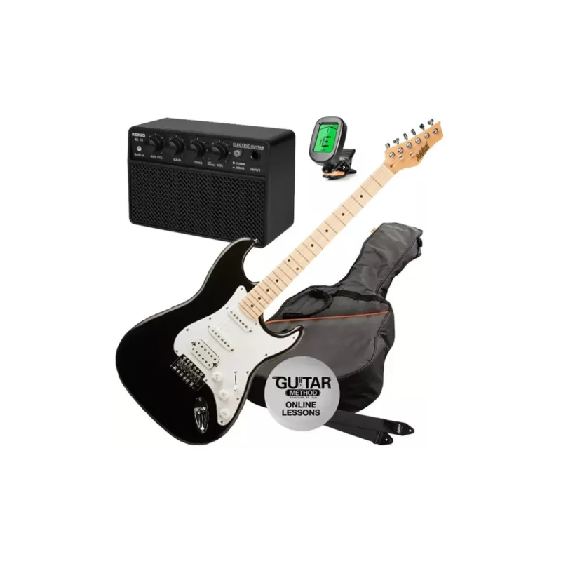 Ashton AG232 MBK SET3 je set obsahující elektrickou kytaru Ashton AG 232 MBK, kombo Kokko KG-10, povlak ARM 200G, ladičku Flanger FT-16T, nástrojový kabel, řemen na kytaru a online lekce hry na kytaru (anglicky). Výborný nástroj pro začátečníky a studenty hudebních škol. Tělo nástroje je vyrobeno ze dřeva Basswood (lípa). Krk je javorový se světlým javorovým hmatníkem. Nástroj je osazen jedním snímačem humbucker a dvěma singly. Ovladače: hlasitost, 2x tónová clona a 5polohový přepínač. Barevné provedení: BK (černé). Kokko KG-10 je malé kytarové kombo pro domácí hraní nebo cvičení. Jedná se o kompaktní a snadno přenositelné kombo s výkonem 10 Wattů, podporou Bluetooth, možností připojení sluchátek a vybavené dobíjecí baterií. Skvělý set pro domácí hraní a cvičení, obsahující vše co do začátku potřebujete.
