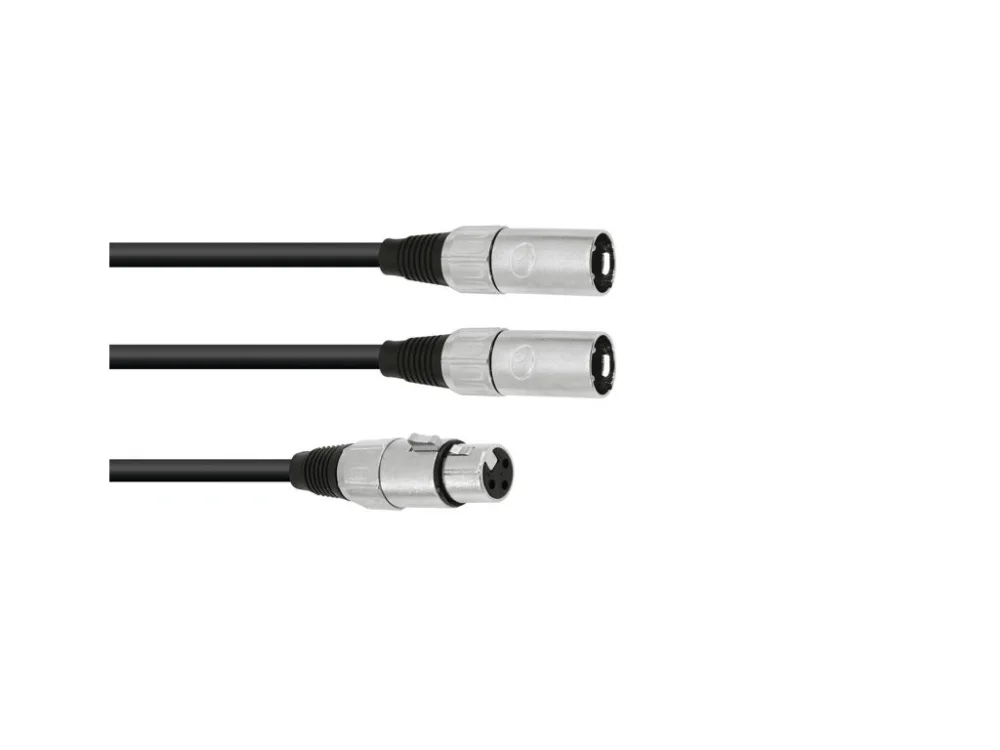 Propojovací kabel 1x 3-pinová XLR zásuvka – 2x 3-pinová XLR zástrčka. Délka kabelu 1 metr, černé barevné provedení.