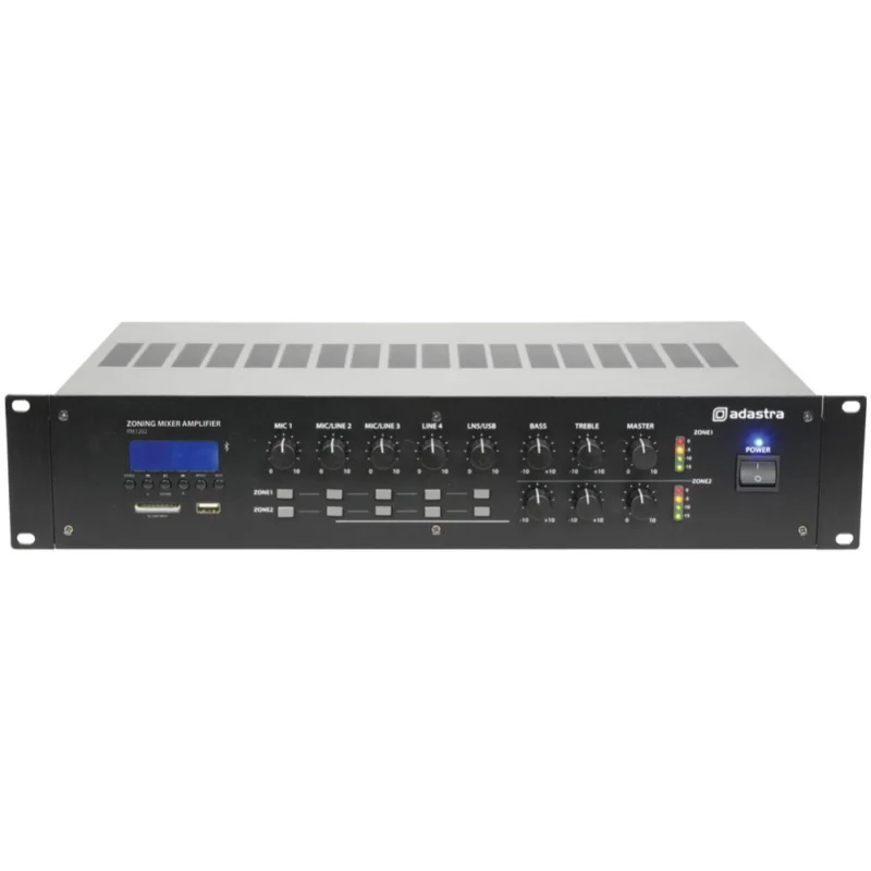 100V mixážní 2-zónový zesilovač s multimediálním přehrávačem. 2 oddělené zóny s výkonem 120W a možností zapojení 100V nebo 4/8 ohmových reproduktorů. Zabudovaný MP3 přehrávač s USB portem, slotem pro SD karty a ovládacím panelem s LED displejem, FM tuner a Bluetooth přijímač. 1x mikrofonní vstup XLR (s možností zapnutí fantomového napájení), 2x kombinovaný mikrofonní/linkový vstup Jack 6,35 mm, 2x linkový vstup RCA (L/R) a 1x linkový výstup RCA (L/R pro 2 zóny). Terminál pro připojení reproduktorů a externího napájecího zdroje 24V DC. Oddělené ovládání úrovně signálu všech vstupních kanálů, samostatné 2-pásmové korekce a regulace hlasitosti pro oba výstupní kanály.