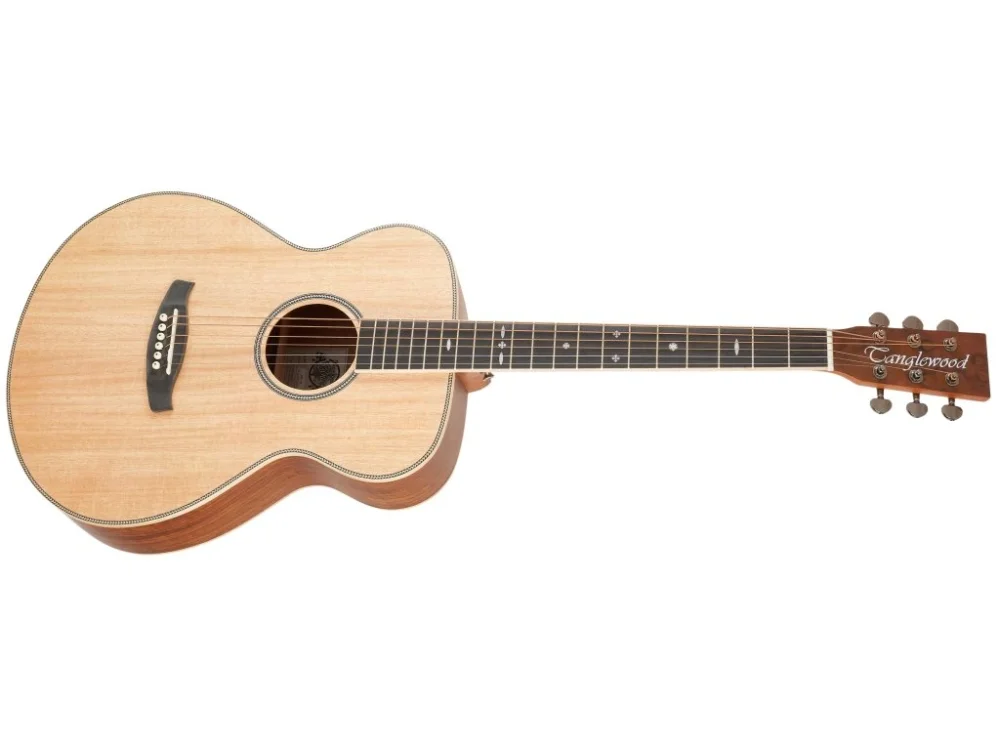 Britská značka Tanglewood představuje cenově dostupnější akustické kytary v retro i moderních designech. Tanglewood TRF HR je akustická kytara s kompaktnějším tvarem těla typu Folk/Orchestra (OM). Přední deska kytary je zhotovena z laminovaného australského červeného cedru, luby z laminovaného ořechu a zadní deska z laminovaného materiálu označeného výrobcem jako Hawaaiian Raintree/Monkeypod, jehož kresba poskytuje kytaře luxusní vzhled. K mahagonovému krku je přilepen hmatník z kompozitního materiálu Eboncore v dekoru ebenu osazený dvaceti pražci. Orientaci po ploše hmatníku usnadňují polohové značky z materiálu ABS. Struny jsou přes nultý a sedlový pražec z plastového materiálu ABS uchyceny v ladících Die-Cast mechanikách a kobylce z kompozitu. Pěkné zpracování podtrhuje oboustranná javorová lemovka těla, rozeta a výložka topu ve vzoru rybí kosti (Herringbone) a dýha na hlavici z materiálu Hawaaiian Raintree/Monkeypod ozdobená firemním logem. Kytara je dodávána v krabici spolu s pickguardem.