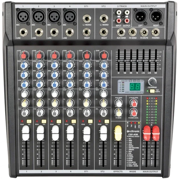 Aktivní 6-ti kanálový mixážní pult, výkon 2x 200W/4 Ohm RMS (2x 130W/8 Ohm RMS), 4x volitelný mikrofonní vstup XLR se 48V fantomovým napájením/linkový monofonní vstup Jack 6,3 mm, 2x stereofonní vstup Jack 6,3 mm, 3-pásmový ekvalizér pro každý vstup, integrovaná efektová jednotka se 16-ti DSP přednastavenými programy, 7-pásmový grafický ekvalizér pro výstup. Zařízení nabízí kompaktní a komplexní řešení pro mobilní PA, bary a speciální akce.