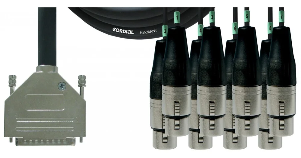 vícenásobná propojka, 25-pinový D-Sub – 8x XLR samice, konektory Rean, délka 3 m, kompatibilní s formátem Tascam, RME, Digidesign, Yamaha apod.