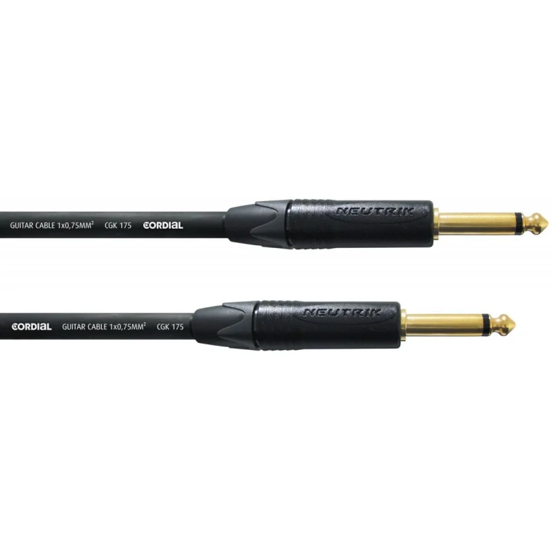 Špičkový nástrojový kabel, Jack 6.3 mono – Jack 6.3 mono, délka 6 metrů, kabel CGK 175, originální konektory Neutrik, pásek na suchý zip, barva černá.