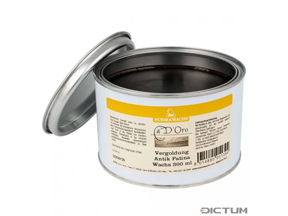 Vosková pasta pro vyplnění pórů pro barevné zvýraznění odhalených pórů dřeva nebo pro vytvoření starožitných efektů (černohnědá patina).Také pro vytvoření starožitného efektu na pozlacených površích.
