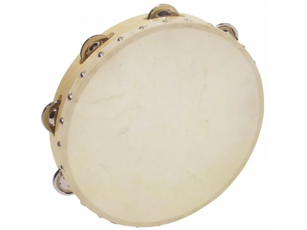 Tamburína s blánou, průměr 25,4 cm (10″). 8 párů plíšků. Přírodní kůže přibitá na dřevěném rámu.