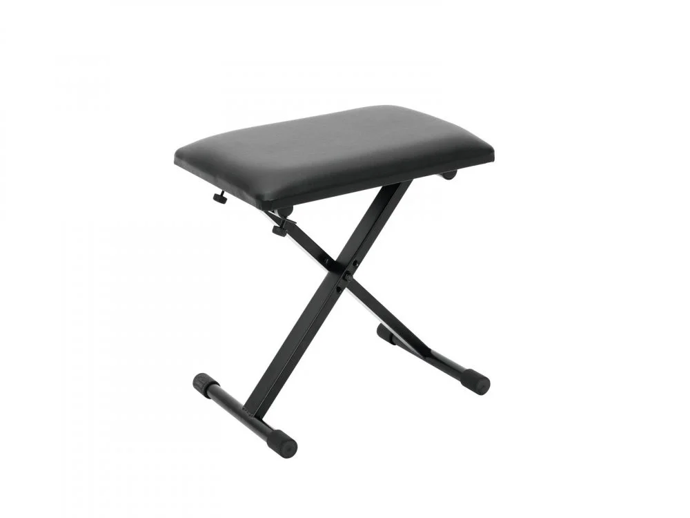 Skládací klávesová stolička. Výškově nastavitelná ve 3 krocích. Vysoká kvalita, pevná ocelová konstrukce. Koženkový sedák. Sedák 42,5 x 30,5 cm.
