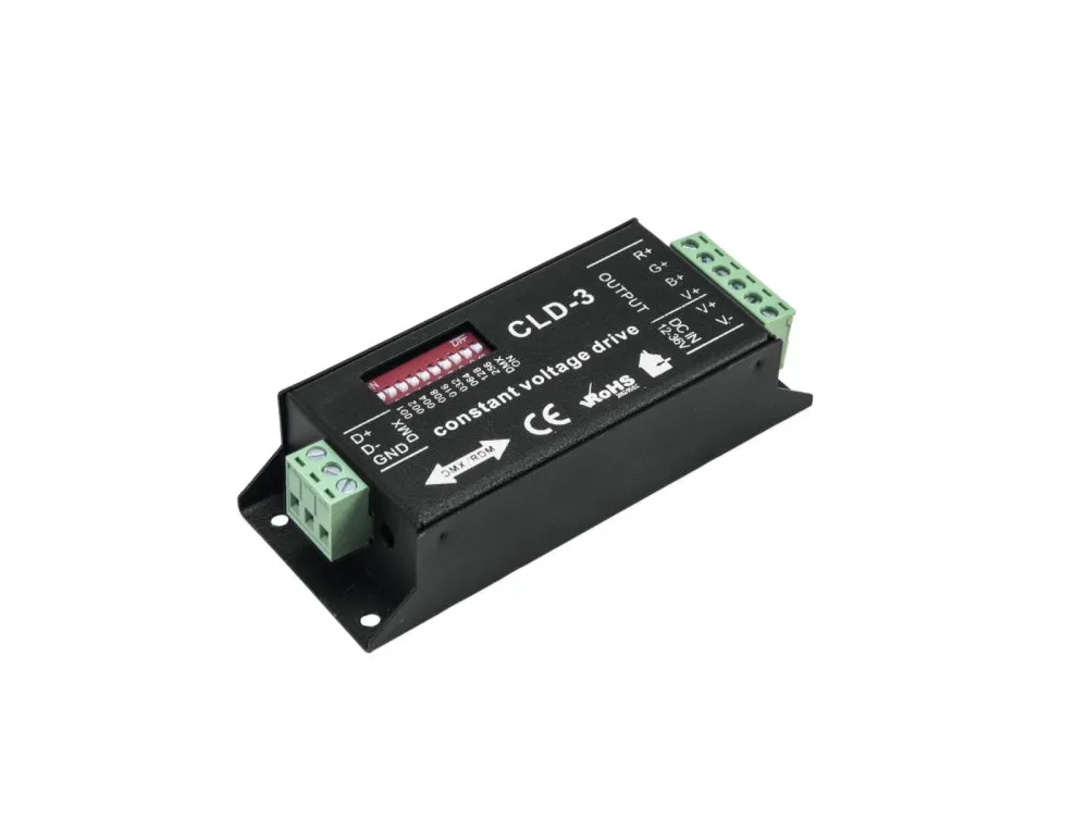 Compact LED controller for controlling RGB LEDs (12-24 V) via DMX. Converts standard DMX512 signals to PWM signals e.g. for driving LED strips. 3 separate control channels for individual color mixing of red, green and blue LEDs. Built-in programs enable stand-alone operation(individual color selection, color change, color fade, running speed). DMX addressing and settings via DIP switches. Plug-in screw terminals for connecting the LEDs and the power supply (accessory). Rugged black metal housing.