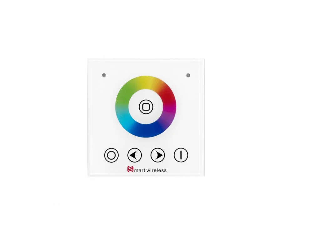 Bezdrátový nástěnný bezdrátový (433.920 MHz) stmívač pro 12-24V RGB LED pásky. Ovladač je určen pro řídící jednotku Eurolite (objednací číslo 50531103). Výběr svícení pomocí barevného kroužku, 10 zabudovaných programů, možnost nastavení rychlosti běžícího programu a jasu svícení. Přenosová frekvence 433,92 MHz, provozní dosah až 20 metrů. Šroubovací svorky pro připojení napájení (100-240 V). Vhodné pro zapuštěné zásuvky, rozteč šroubů zařízení 60 mm.