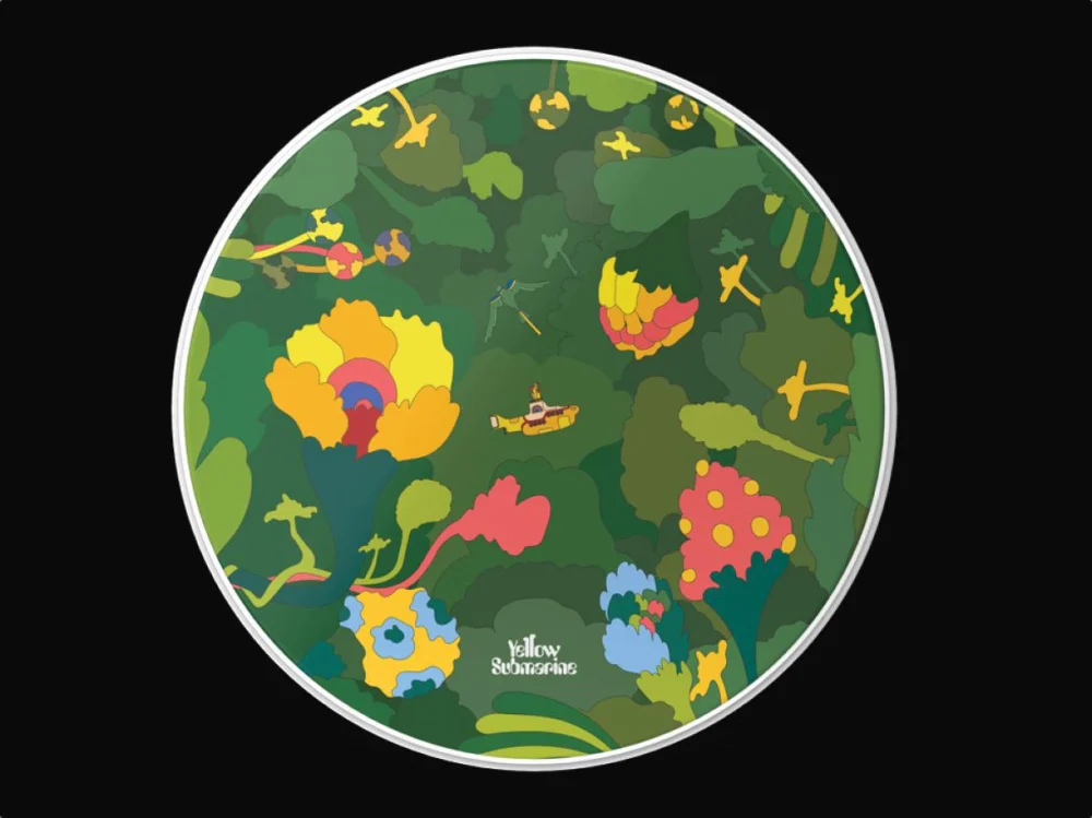 EVANS Yellow Submarine Bass Drumhead – Resonanční blána pro basový buben ze surrealistického a psychedelického světa legendární Žluté ponorky od Beatles. Limitovaná edice blan, vydaná k 55-ti letému výročí vydání alba Yellow Submarine.