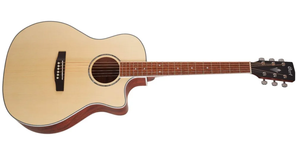 elektroakustická kytara, typ grand auditorium, resonanční deska: smrk, luby a zadní deska: mahagon, krk: mahagon, hmatník: merbau, šířka nultého pražce 45 mm, menzura 648 mm, 20 pražců, elektronika Cort CE306T se zabudovanou ladičkou.