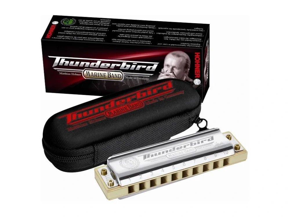 Model Marine Band Thunderbird kombinuje špičkové inovativní technologie firmy Hohner s kovovými kryty, které navrhl legendární „customizer“ Joe Filisko. Tím byl vytvořen nový standard pro nízko hrající „low key“ harmoniky. Tento nový revoluční model nabízí bezprecedentní hlasitost a rychlost reakce ve velmi nízkém rejstříku prakticky bez rušivého chrastění hlásků. Skvělý hluboký zvuk této harmoniky překoná veškeré představy a stane se pro Vás velmi inspirativní.