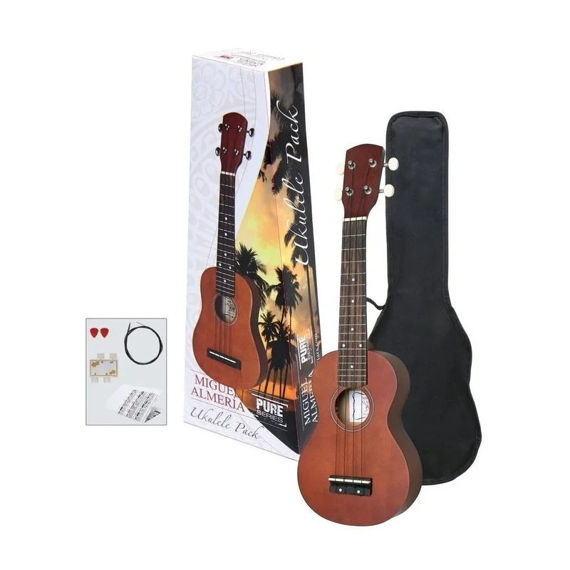 Sopránové ukulele v praktickém setu, který obsahuje obal, ladící píšťalku (A-D-F#-B), náhradní struny, tabulku hmatů (C-a D-ladění) a 2 trsátka.