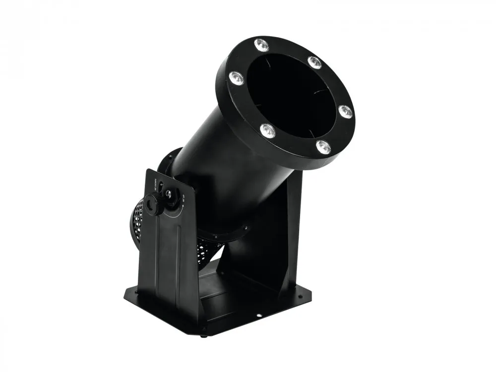 Chrlič konfet ovladatelný přes DMX512 protokol nebo dodávaným bezdrátovým ovladačem. Výstupní tryska je obklopena 6x 8 W RGBA LED pro hezčí efekt, s možností nastavení barev, míchání barev, změny jasu a stroboskopu. Nastavení úhlu vystřelování konfet: Výška vystřelování při 90° až 5 metrů, vzdálenost dopadu při 45° až 5.5 m. Ovládací panel se čtyřmi tlačítky a LED displejem. Odolné kovové pouzdro pro instalaci na truss konstrukce.