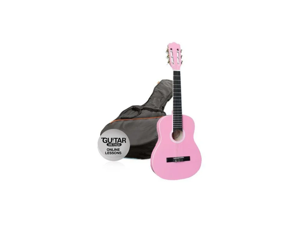 Paket klasické 4/4 kytary Ashton SPCG 14 v barevném provedení – růžová. Vynikající poměr kvalita/cena. Součástí dodávky je obal na kytaru a online škola hry (angličtina). Vrchní deska linden (lípa), krk javor, struny nylonové. Vhodná např. pro začátečníky – od 13 let (cca 160 cm).