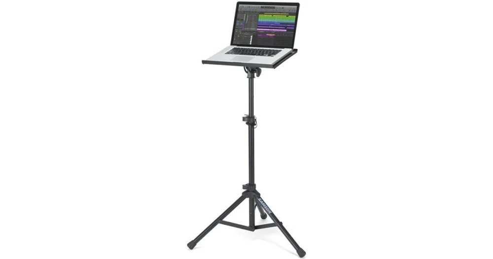 stojan pro laptop a notebook, stabilní základna na třech nohách, silikonový povrch zabraňuje sklouznutí počítače, nastavitelný sklon desky, masivní ocelová konstrukce, nastavitelná výška, uzamykatelné petlice a dodatečné zajištění pomocí kovového trnu, odnímatelná vrchní deska