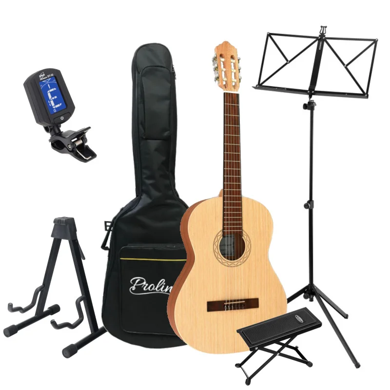 Set obsahující klasickou kytaru portugalské výroby APC Lusitana GC200 OP velikosti 3/4, dále obal, skládací notový stojan s obalem, stojan pro kytaru, podnožku a ladičku.