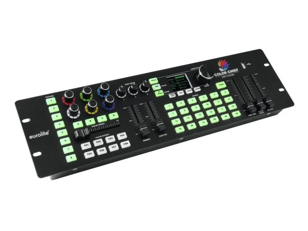 Inovativní ovládání LED světelného parku pomocí stolního DMX kontroléru. Ovládací pult je určený pro řízení LED reflektorů, světelných LED barů a jednoduchých LED světelných paprskových efektů. Pro 8 samostatných světelných efektů nebo skupin se 4 segmenty. Každé zařízení může mít až 30 ovládacích kanálů. Rychlé a snadné programování, některá zařízení Eurolite (např. KLS světelné rampy nebo LED reflektory) jsou již uloženy v knihovně ovladače. Další zařízení lze snadno konfigurovat manuálně. Přímá volba 8 barevných efektů, 3 další kanály jsou k dispozici pro další funkce (např. pro ovládání rotace). 24 paměťových míst pro scény a chasery, které mohou být spuštěny současně. USB port pro ukládání dat programů. Ovládání zvukem pomocí audio signálu nebo manuální spouštění tlačítkem TAP. Master dimmer (stmívání), manuální ovládání rychlosti programu a nastavení jasu svícení. Připojení DMX pomocí 3 pinového konektoru XLR. Aktualizace firmwaru přes USB.