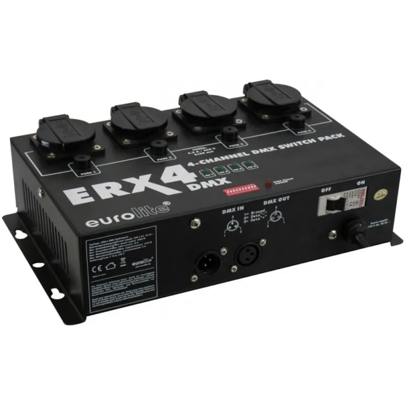4-kanálový DMX Switch pack (spínač) světelného parku pro LED efekty nebo zařízení s nízkým odběrem proudu (jako jsou např. motorky zrcadlových koulí, zářivky apod.). 4 DMX kanály, adresování DMX adresy pomocí DIP přepínačů, každý kanál s LED kontrolkou stavu. Zatížení 5A pro každý kanál, maximální zatížení 16A/3680W. Vhodné pro instalaci přímo na pódiové konstrukce, zdi či pevnou podložku.