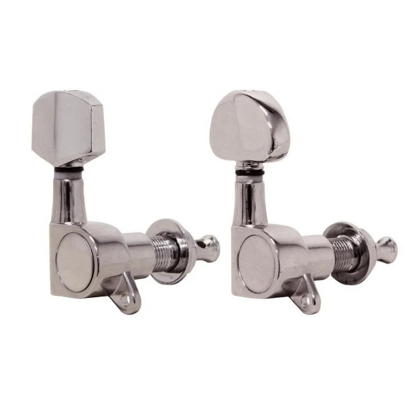 Kytarová ladící mechanika; Pro kytary s plnou/zavřenou hlavou; Pochromované single mechaniky, odkryté; Cena za sadu; Zavřené, olejované single mechaniky s velikým knoflíkem, pochromované; Pro vrtání 10 mm; Sada, 3 levé, 3 pravé;