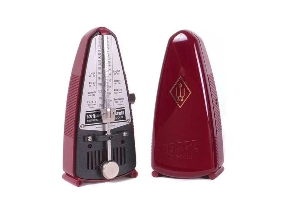 Mechanický metronom, model Piccolo, série Taktell od firmy Wittner. Hodinový strojek, plastové tělo, barva tmavě červená (ruby).