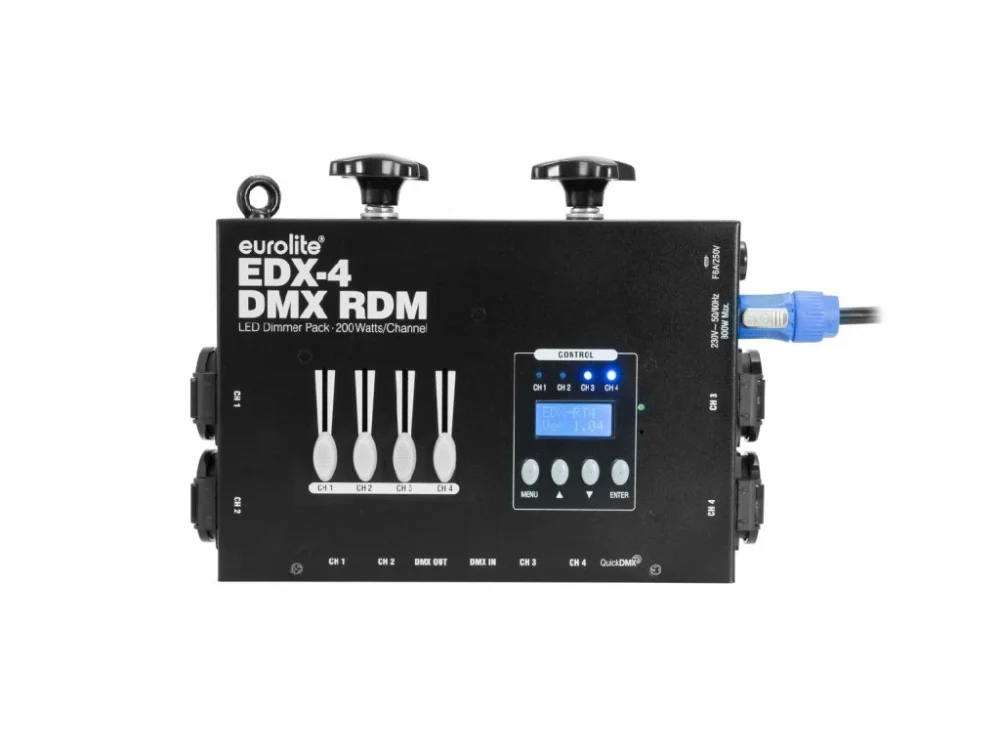 4 stmívací kanályMax. zatížení kanálu 200 wattůDMX, automatický a hudební režimJe možné nezávislé DMX adresování na kanálQuickDMX konektor pro bezdrátové DMX připojení16 integrovaných chaser programů s nastavitelnou rychlostíProvoz stmívače nebo spínače4 kanálové fadery pro ovládání na zařízeníOvládací panel s LCD displejem pro snadnou konfiguraciLED indikátory stavu na výstupní kanál2 x letící bod M10Vstup a výstup pro snadné připojení napájeníLze provozovat v 1; 4; Režim 6 CHOvládání pomocí QuickDMX přes USB (volitelné); RDM; Samostatný; Zvuk do světla přes mikrofon; DMXTento výrobek je vybaven zásuvkami typu Schuko CEE 7/4 (typ F) bez otvoru pro zemnící kolík. Vhodné pro zástrčky Schuko (typ F) a univerzální zástrčky CEE 7/7. Nemusí být kompatibilní s českými zástrčkami (typu E). V případě mechanické nekompatibility doporučujeme dokoupení vhodného typu koncovky.