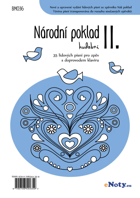 Národní poklad hudební II. je druhý díl úspěšného zpěvníku Národní poklad a opět Vám nabízí 35 lidových písní v úpravě pro zpěv s doprovodem klavíru. Písně do zpěvníků Národní poklad byly vybrány z původního zpěvníku Náš Poklad, který byl vydán začátkem 20. století Ferdinandem Sládkem (1872-1943). Všechny písně byly pečlivě přepsány do nové notové podoby, většina písní byla transponována do tóniny rozsahově vhodnější pro současné zpěváky a melodická linka byla doplněna o akordové značky. U všech lidových písní je uveden také její rozsah, pro usnadnění výběru rozsahově vhodné písničky. V seznamu skladeb je kromě názvu písně uvedená také oblast, ze které lidová píseň pochází a pro koho je text písně určen (chlapecký, dívčí, pro všechny a duet – kdy je většinou jedna sloka dívčí a jedná chlapecká).