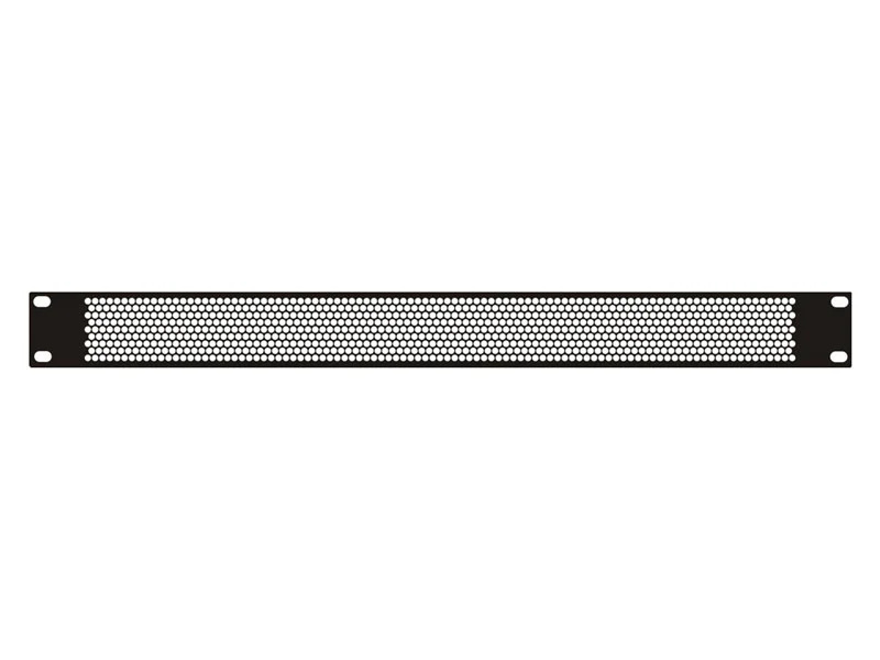 Kovový ventilační rackový panel 1U s lemem, kruhová perforace pro ideální ventilaci, kvalitní černý nástřik, síla materiálu 1,2mm, rozměry 482,6mm x 44,4mm. Hmotnost 0,23Kg.