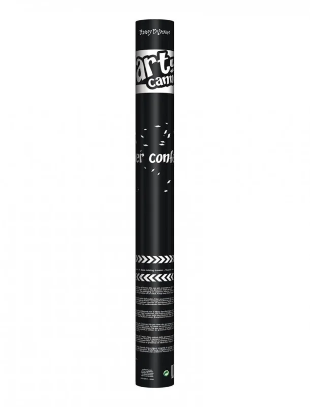 Stříbrné obdélníkové konfety z metalické folie v kartonovém 60 cm tubusu, vystřelované stlačeným vzduchem pootočením spodní části tubusu ve směru šipek. Nemiřte na lidi. Dodržujte bezpečnou vzdálenost 5 m. Vhodné pro použití v exteriéru i interiéru.