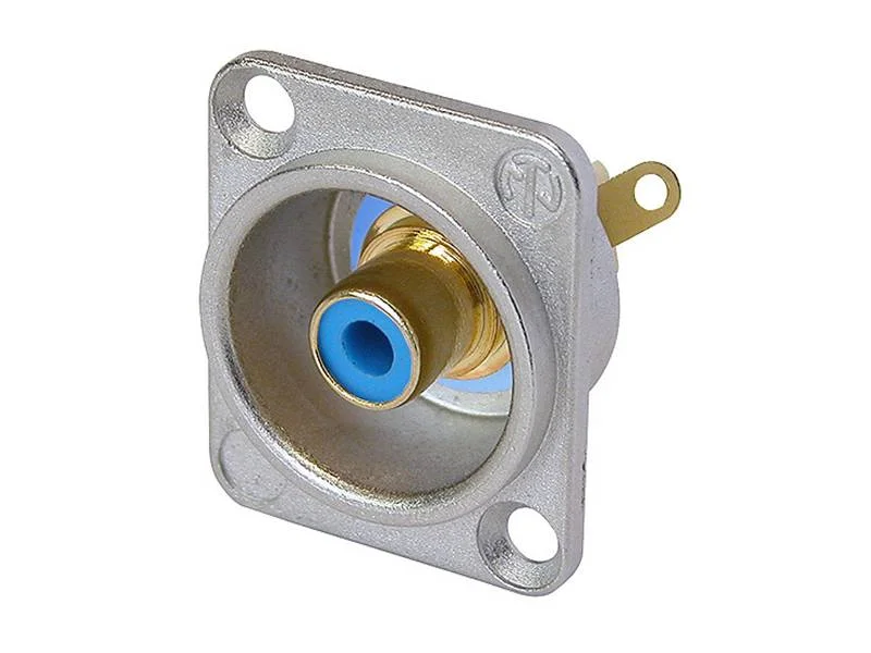 Neutrik panelový RCA (CINCH) konektor. Celokovové tělo ve stříbrném provedení, izolováný vnitřní konektor, D-rozměr, pozlacené kontakty určené pro letování. Barva rozlišení – modrá.