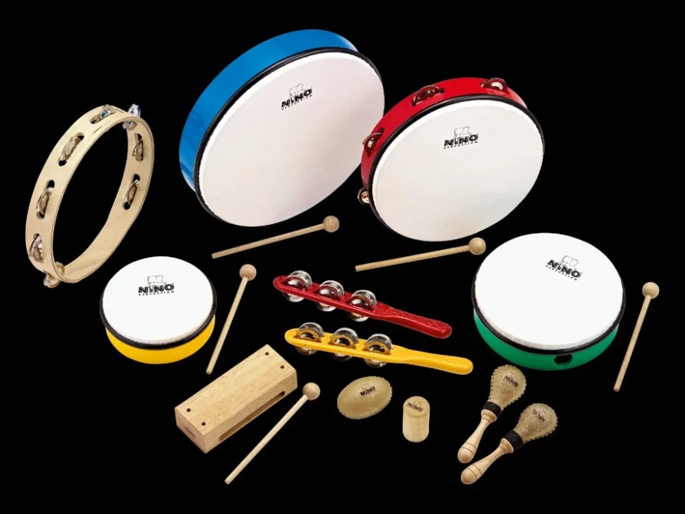 • Set obsahuje: 1 x ABS Ruční buben 12” (NINO6SB), 1 x ABS Tamburína 10” (NINO24R), 1 x ABS Ruční buben 8” (NINO45GG), 1 x ABS Ruční buben 6” (NINO4Y), 1 x Kožené Maracas pár, malé (NINO10), 1 x Dřevěný blok, velký (NINO22), 1 x Kožený Egg Shaker (NINO11), 1 x Jingle palice, žlutá (NINO13Y), 1 x Jingle palice, červená (NINO13R), 1 x Dřevěná tamburína, 10” (NINO14), 1 x Dřevěný shaker, malý (NINO1), 1 x Dřevěný Box, velký