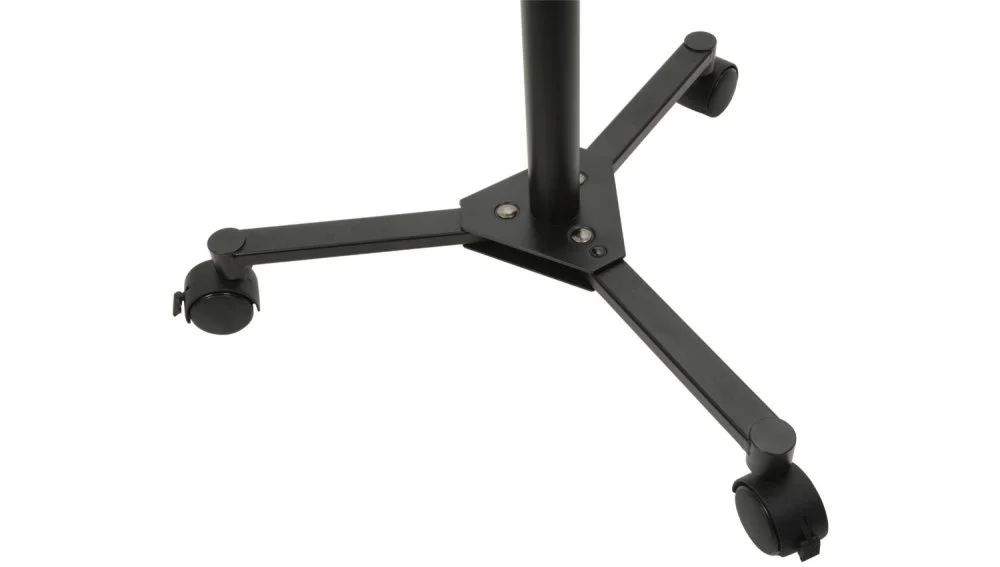 Mobilní stativ vhodný pro mobilní prezentace, přednášky, školení apod. Robustní stojan s kolečky má desku s polstrovanými stranami pro bezpečné umístění laptopu, projektoru či jiného příslušenství. Možnost nastavení požadované výšky v rozpětí 880 až 1430 mm, brzdy na kolečkách, možnost naklonění a zajištění desky v požadované pozici. Kvalitní ocelová konstrukce, možnost složení nohou základny pro snadnou manipulaci a transport.