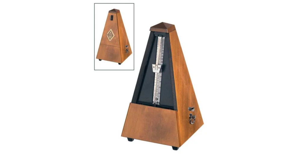 Metronom, pyramidový tvar, dřevěný kryt, se zvonkem, v ořechové barvě