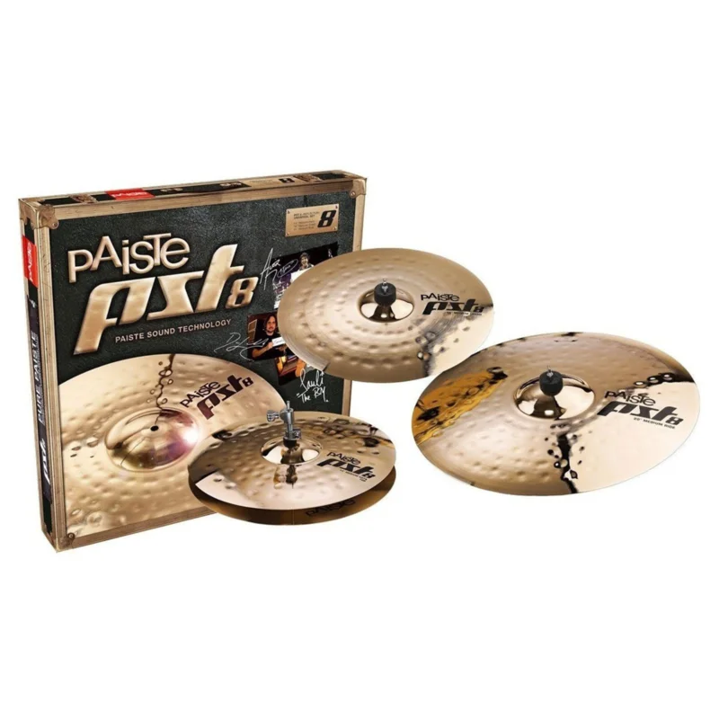 Krabicová sada činelů Paiste z řady PST 8. Paiste Sound Technology 8 (PST 8) je řada činelů, která přišla na trh v roce 2012. činely PST 8 jsou vyrobeny z léty prověřené a zatím nepřekonatelné slitiny CuSn8, známé také jako bronz 2002, protože z téže slitiny se vyrábí i legendární řada Paiste 2002. K dosažení zvukové dokonalosti jsou činely PST 8 vyráběny za pomocí nejmodernějších švýcarských technologií, ale při jejich výrobě byl také zvýšen podíl rukodělné práce – jsou tradičně ručně tepány a broušeny. Mají průrazný, plný, energický a čistý tón, vhodný do studia i na živá vystoupení. Povrchová úprava je leštěná patentovanou technologií Reflector, která přidává na brilantnosti nejen vzhledu, ale především zvuku. Paiste PST 8 nejsou na rozdíl od činelů prémiových řad odlévány jednotlivě, což ale na druhou stranu znamená výrazné snížení nákladů a tedy i jejich ceny, aniž byste přitom museli slevovat na kvalitě zvuku.
