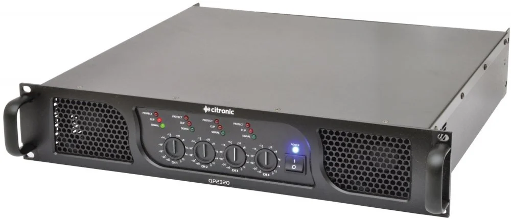 Výkonové zesilovače Citronic řady QP. 4 nezávislé kanály s individuálním ovládáním hlasitosti. 4 linkové XLR vstupy a 4 paralelní XLR výstupy umožňují připojení signálu do dalších zesilovačů. Možnost zapojení reproduktorů v režimech 2, 4 nebo 8 Ohmů. Zabudované ochranné obvody. Připojení reproduktorů pomocí Speakon konektorů. Možnost montáže do 19“ racku, výška 2HE.