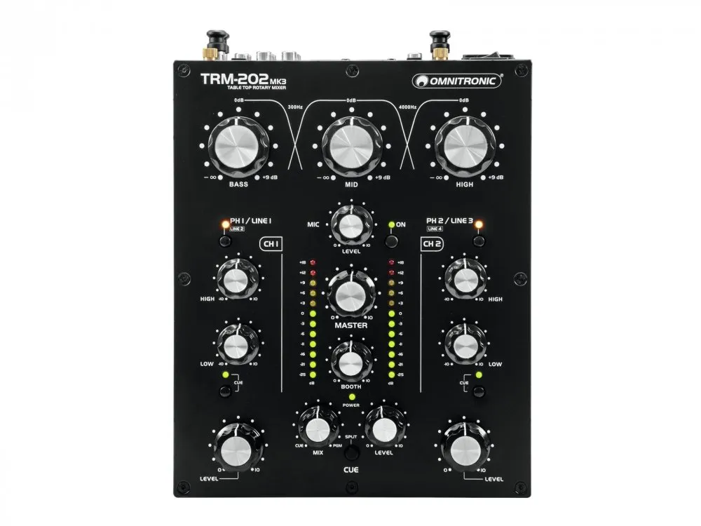 Kanály: Vstupní kanál = 2 x stereo s přepínačem Line-Line/Phono přes RCA, ovládání kanálů pomocí Rotary, 2-pásmové ovládání tónu EQ, přepínač CUE, otočný přepínač zesílení Phono, volič zdroje; Kanál mikrofonu = 1 x mono přes XLR, ovládání kanálu pomocí otočného ovladače, přepínač ON AIR; Booth výstup = 1 x stereo přes XLR nebo RCA, ovládání kanálů pomocí otočného ovladače; Master výstup = 1 x stereo přes XLR nebo RCA, ovládání kanálů pomocí otočného voliče; Sluchátkový výstup = 1 x stereo přes Jack, ovládání kanálu pomocí otočného ovladače, funkce Cue mix split