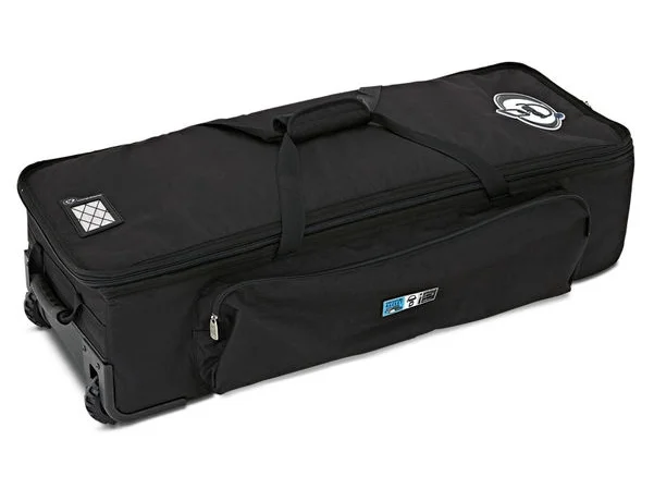PROTECTION RACKET – Pouzdro pro hardware. Obal je vyrobený z nepromokavého a velmi odolného materiálu Racketex. Boční stěny tvoří dvouvrstvá pěna, jejíž vnější tvrdší vrstva zaručuje pevnost a stabilitu pouzdra, druhá vrstva zajišťuje bezpečí a pohodlí hardwaru.Obal má rozměry 47″ x 18″ x 10″, je vybaven kolečky a výsuvným madlem, z vnější strany jsou připevněna tři ucha a na boční straně má velkou vnější kapsu. Na pouzdře nechybí kvalitní zip, který je možno uzamknout zámečkem (není součástí pouzdra), štítek s rozměry a kapsa pro kartičku s iniciály majitele.