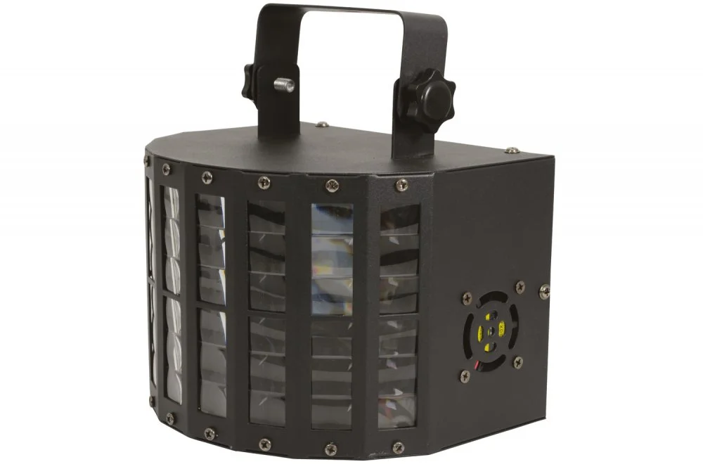 Klasický LED paprskový efekt projektuje do prostoru rotující nebo blikající svazky barevných paprsků. Efekt je osazen 3W LED diodami (červená, zelená, modrá, jantarová, žlutá, purpurová, teplá bílá, studená bílá a UV). Ovládání hudbou nebo pomocí DMX signálu, automatický provozní režim s funkcí Master/Slave. Dodáváno včetně montážního držáku a IR dálkového ovladače.