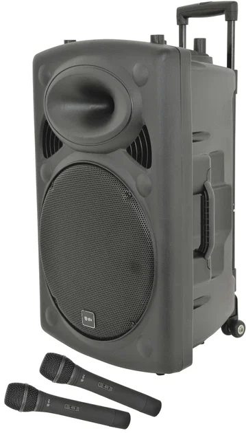 Mobilní 15″ zvukový systém, zabudovaný zesilovač s výstupním výkonem 50W + 50W max. Napájení volitelně ze sítě 220-240V AC 50Hz (IEC), 12/15V DC 3A nebo pomocí zabudovaného dobíjecího 12V akumulátoru s výdrží až 8 hodin. Integrovaný MP3 přehrávač, přijímač Bluetooth 4.0, SD/MMC slot, USB port, FM přehrávač, 2x bezdrátový VHF ruční mikrofon (174,1 MHz + 175,0 MHz), IR dálkový ovladač, ovládací panel MP3 přehrávače s displejem, linkový vstup 2x RCA (L+R), linkový výstup 2x RCA, vstup aux stereo mini jack 3,5 mm, vstup Jack 6,3 mm pro mikrofon/kytaru, vstup Jack 6,3 mm pro mikrofon se samostatnou regulací hlasitosti a Echo efektem, regulace výstupní hlasitosti systému, regulace basů, výšek, oddělená regulace hlasitosti bezdrátových mikrofonů, přepínatelná funkce VCV talkover. Robustní plastové provedení, boční madla, výsuvná rukojeť, kolečka ve spodní části. Ideální pro domácí zábavu, oslavy a párty, prezentace a výstavy apod.