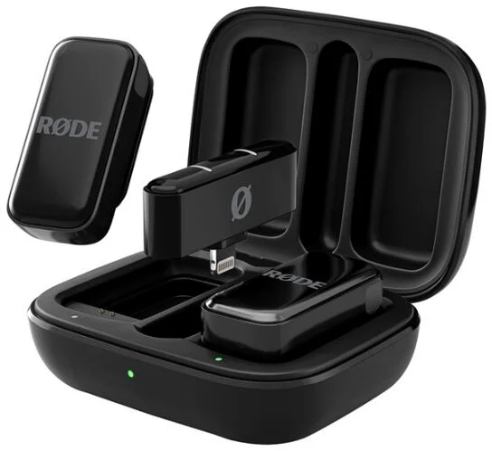 dvoukanálový bezdrátový systém, pro iOS telefony a tablety, 2.4 GHz, dosah 100 metrů, výdrž až 21 hodin, vestavěné všesměrové mikrofony na vysílačích, nabíjení akumulátorů v dokovací stanici, barva černá, v ceně 2x protivětrná ochrana