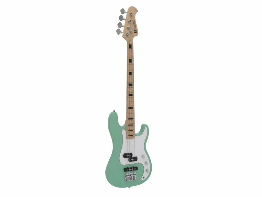 Elektrická baskytara typu Precision, vintage styl. Tělo lípa, bílý pickguard, šroubovaný krk javor, profil D, dvojčinný trussrod, menzura 890 mm, hmatník javor, 21 pražců, nultý pražec 42 mm, kobylka vintage PB, chromovaná mechanika standardní „P“, 1x dělený jednocívkový snímač (PB), 1x jednocívkový snímač (JB), 2x ovládání hlasitosti, 1x ovládání tónu. Barva surf green lesklá.