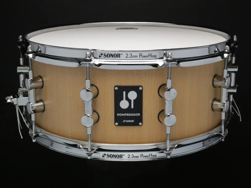 Sonor Kompressor– nová řada bubínků značky Sonor disponuje širokou škálou rozměrů a materiálů, aby si každý hráč mohl zvolit nástroj podle svých potřeb. Korpusy jsou vyrobeny z oceli, hliníku, mosazi a nebo také z bukového dřeva a je na výběr jak z 13″, tak 14″ bubínků v různých hloubkách. Použitá technologie Optimum Shell Measurements (OSM) znamená, že průměr korpusu je nepatrně zmenšen, což zaručuje lepší kontakt úložných hran s blánou pro optimální rezonanci. Stálost ladění zaručuje systém TuneSafe, který pomáha udržet ladicí šrouby ve své pozici. Nástroj je osazen 2,3 mm ocelovými ohýbanými ráfky a jednoduchou, přesto bytelnou mechanikou strunění.To vše doplňují blány Remo USA. Jedná se o velmi univerzální a plně profesionální bubínky.
