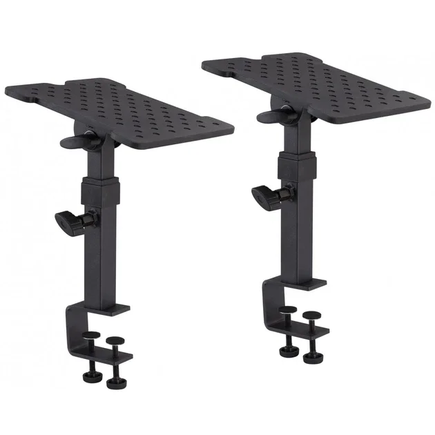 Univerzální stolní stojan vhodný pro studiové monitory a reproduktory. Stojan disponuje podstavcem s pogumovaným povrchem, dvěma šroubovými závity pro připevnění ke stolové desce o výšce do 50 mm, nastavitelnou výškou a sklonem pro detailní nastavení monitoru při nahrávání, mixu, kritickým poslechu nebo finálním masteringu.