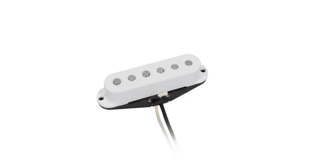 Jednoduchá cívka (single coil), Alnico 5 rods, černé cívkové vlákno, voskovaný smaltovaný drát, 6.5K krk, bílá