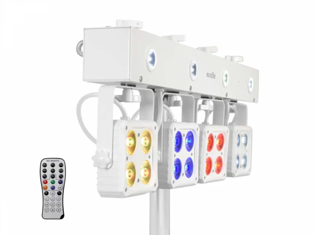 Kompaktní světelný set s IR dálkovým ovladačem se 4 výkonnými LED reflektory 4x LED QCL 8W a4x stroboLED CW 1W, adaptér pro uchycení na stativ či konstrukci. Samostatné ovládání každého reflektoru pomocí DMX ovladače nebo bezdrátového 4 pedálového nožního ovladače pro volbu programu, ovládání zvukem, funce Freeze a Blackout. DMX 512 ovládání pomocí standardního světelného ovladače (3/4/8 nebo 21 ovládacích kanálů). Ovládání zvukem pomocí vestavěného mikrofonu, Strobo efekt, automatický provozní režim, zabudované programy, funkce Master/Slave. Dodáváno v praktickém přepravním pouzdře.: Napájení: 230V AC, 50 Hz