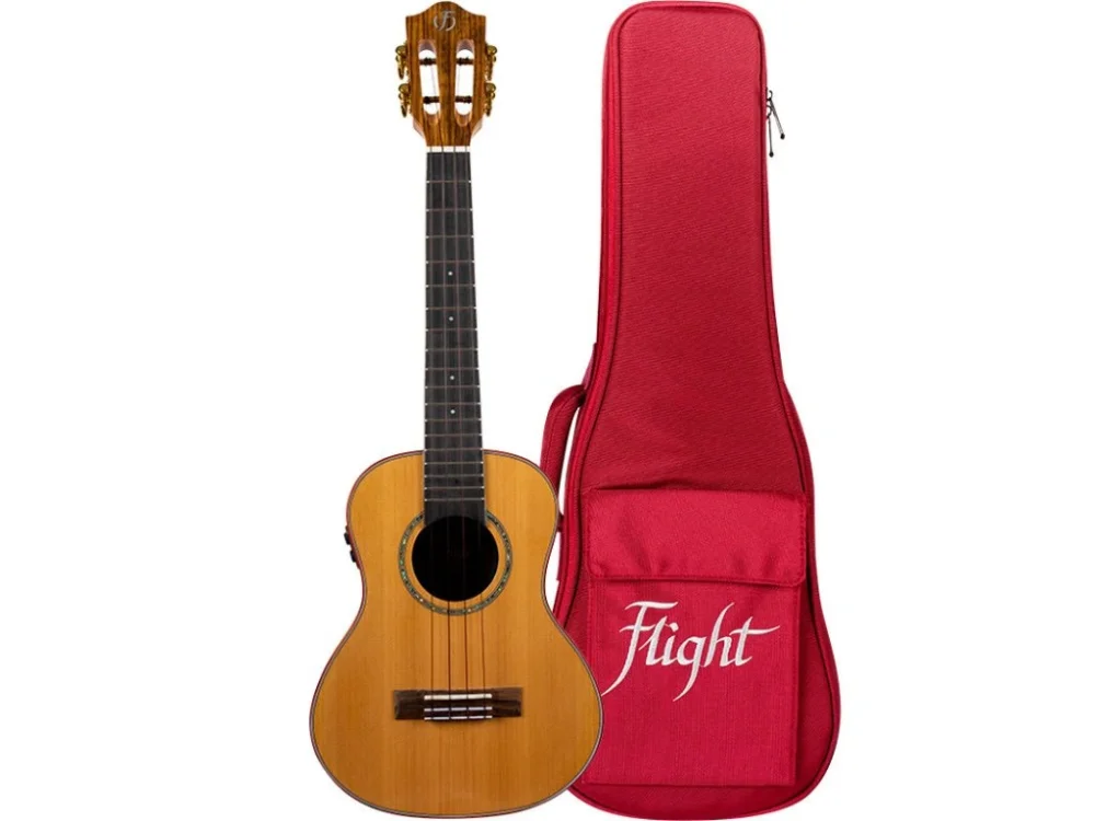 Elekto akustické tenorové ukulele Flight DIANA TE Soundwave má přední desku z masivního cedrového dřeva, luby a záda z mořeného ořechu. Krk je vyrobený ze dřeva okoume, hmatník a kobylka ze dřeva purplewood. Nultý pražec a kobylková vložka je kostěná.