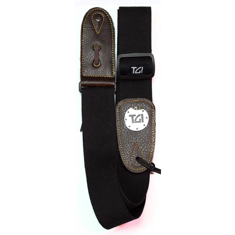 Popruh na kytaru tkaný v černém barevném provedení s pevnými koncovkami z umělé kůže a efektním kovovým logem TGI.